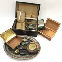 Collection of mixed curios hosed in a wooden box to include badges lighters a Stratton case etc.